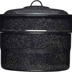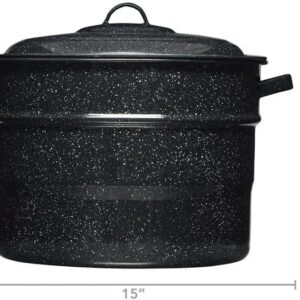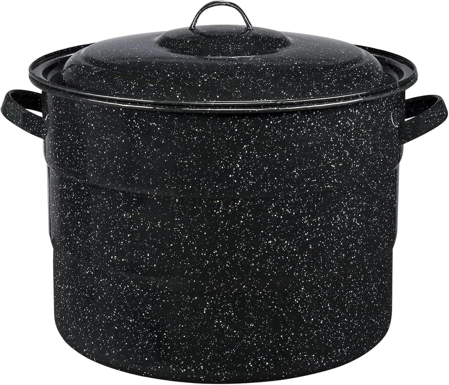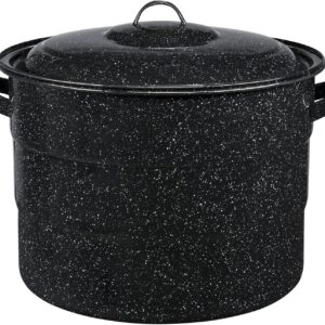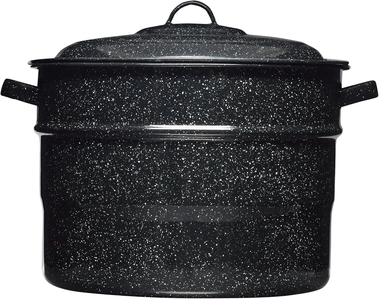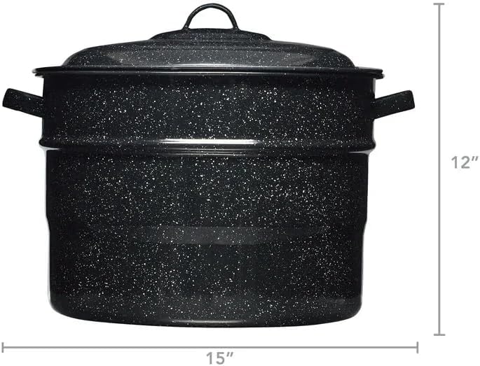 Preserve your favorite foods with ease with this 21-quart enameled preserving pot, a must-have for traditional canning and sterilizing jars. With fitted lids and a folding metal rack, this pot set accommodates jars of all sizes, from half-pints to quarts, for flexible food storage. The heavy-duty steel base distributes heat evenly, while the smooth porcelain coating ensures your ingredients remain pure and untouched by metal or chemicals. This enameled pot withstands temperatures up to 932°F, making it perfect for boiling water canning over gas, electric, or even campfires. From pickling garden vegetables to sealing jams or condiments, this large canning pot is reliable and built to last. The rack safely handles hot jars and folds flat for easy storage. With a scratch-resistant finish, this pot is tough enough for everyday use, making it your go-to for easy home preserving and canning.