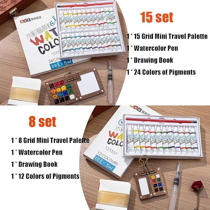 Tobios Watercolor Set, Tobios Mini Watercolor Travel Kit with A Picture Book, Mini Watercolors Paint Set for Beginners With 12/24 Color Paints